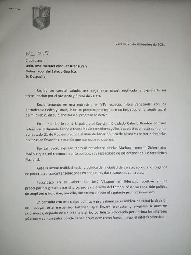 Reiteró que “ante la actual realidad social y política de Zaraza, acudo a los órganos de poder para concertar soluciones en conjunto y dar respuestas concretas”.