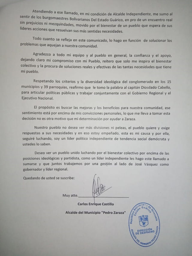 La decisión se tomó este sábado luego de una reunión del alcalde Carlos Castillo con su equipo. En un comunicado el alcalde de Zaraza electo en la Alianza Democrática opositora hace “un pronunciamiento político inspirado en el sentir social de mi pueblo”.