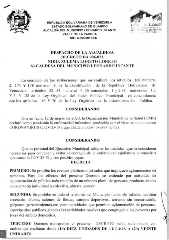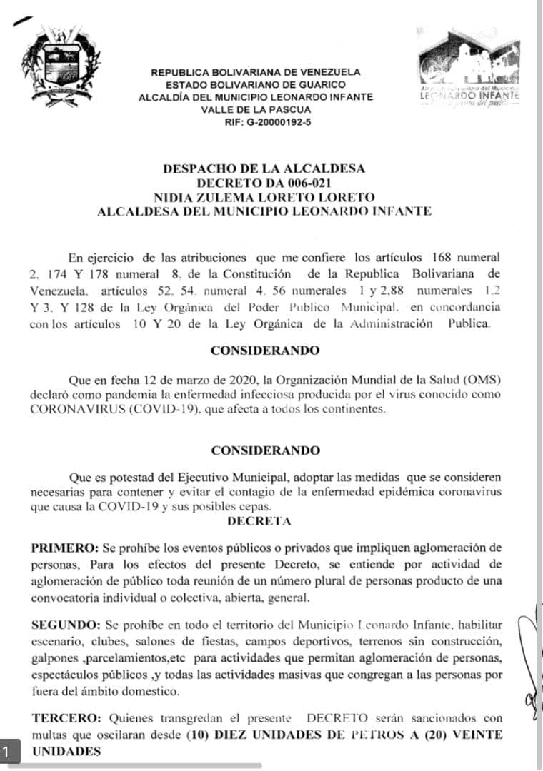 La Alcaldía del Municipio Leonardo Infante emitió este viernes 18 de Junio del 2021 un decreto dónde prohíbe las aglomeraciones en todo el territorio municipal, en espacios abiertos o cerrados.