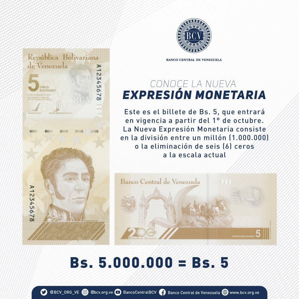 Los nuevos billetes del cono monetario serán de Bs. 5 (equivale a 5.000.000); Bs. 10 (equivale a 10.000.000); Bs. 20 (equivale a 20.000.000); Bs. 50 (equivale a 50.000.000) y Bs. 100 (equivale a 100.000.000).