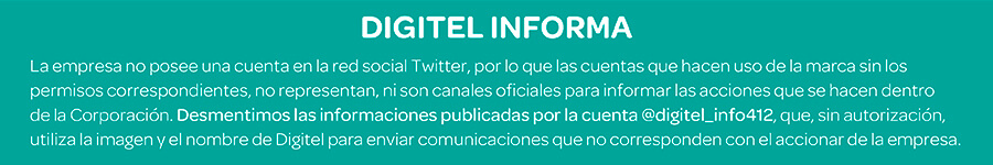 “Desmentimos las informaciones publicadas por la cuenta @Digitel_info412 que, sin autorización, utiliza la imagen y el nombre de Digitel para enviar comunicaciones que o corresponden con el accionar de la empresa”, señala parte de un breve comunicado publicado en el portal web de la compañía.