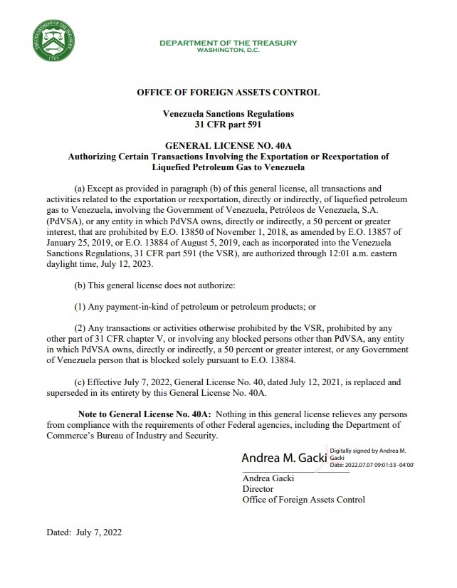 La nueva licencia, identificada con el número 40A, renueva la medida similar emitida el 12 de julio de 2021 bajo el nombre Licencia General N° 40, y extiende su vigencia hasta el 12 de julio de 2023.