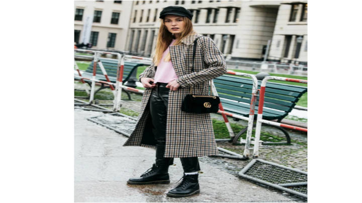 Un abrigo de cuadros donde su estampado es sencillo y no llama la atención individual, por su alto sentido del trendsetter conjuga básicos, como los pantalones negros de efecto de piel, los botines militares, jersey rosa y una bolso de lo más clásico de Gucci.