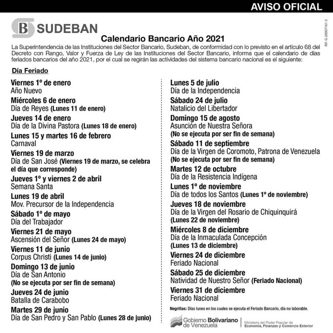 La Superintendencia de las Instituciones del Sector Bancario (Sudeban) difundió el calendario de días feriados bancarios para el próximo año 2021.