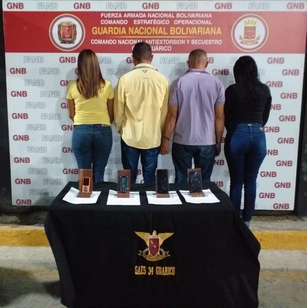 Cuatro personas fueron capturadas por efectivos del Grupo Antiextorsión y Secuestro (GAES-CONAS) del estado Guárico, luego que los mismos participaran en la extorsión a una profesional de la zona, la cual le solicitaban 5.000 dolares para no atentar contra su vida.