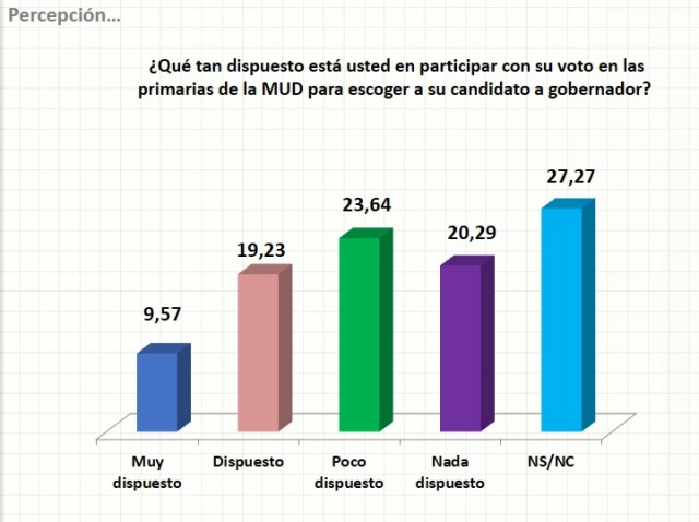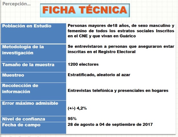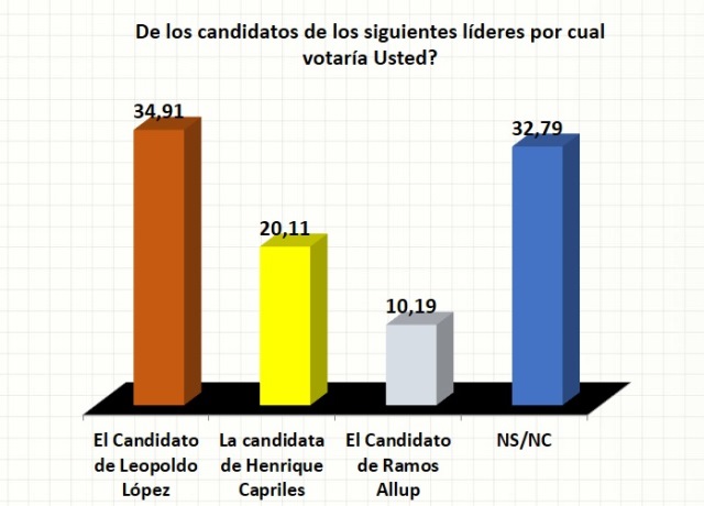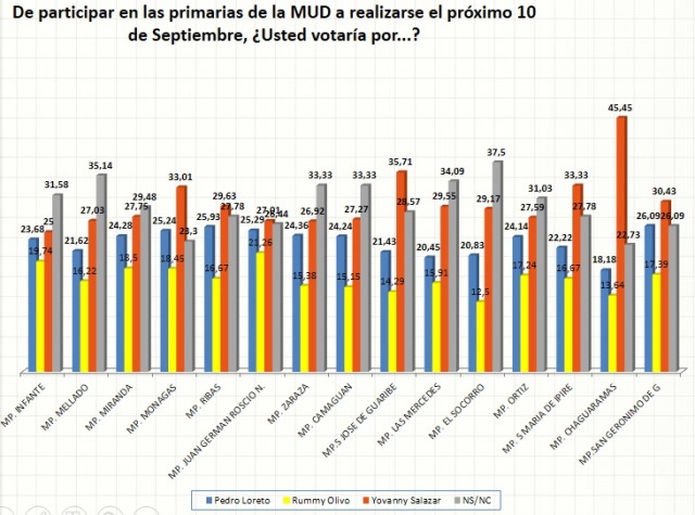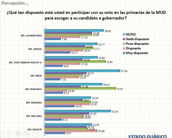 El resumen destaca el liderazgo de Leopoldo López sobre Henrique Capriles y Henry Ramos Allup reiterando que el candidato de Leopoldo López, Yovanny Salazar arrasa con el 34,91% de la intención de votos de los guariqueños. Mientras la candidata de Henrique Capriles, Rummy Olivo lo sigue con el 20,11%. Por su parte el candidato de Henry Ramos Allup, Pedro Loreto queda rezagado con un 10,19%.