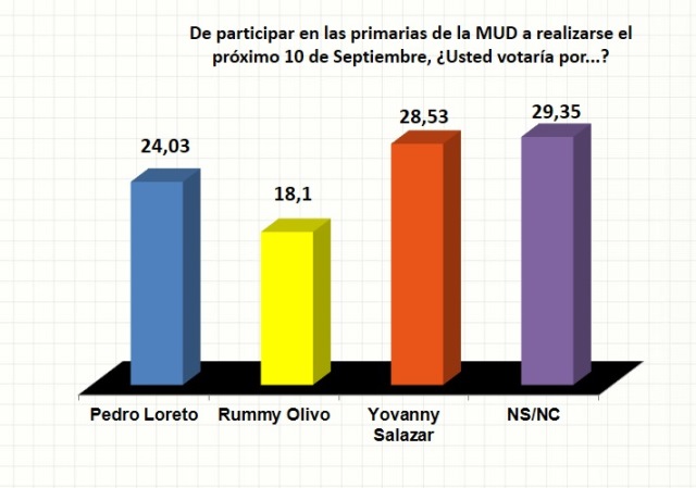 Según León, el candidato Yovanny Salazar ganaría con una amplia ventaja las elecciones primarias este próximo domingo 08 de septiembre, con un 51% de los votos, quedando de segundo el candidato de Acción Democrática Pedro Loreto y de ultimo la candidata por Primero Justicia Rummy Olivo.