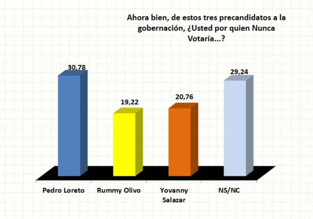 De igual manera reflejo en las gráficas Ismael León, que el candidato con más rechazo en el estado Guárico según las encuestas seria Pedro Loreto con el 30,78%, seguido de Yovanny Salazar con el 20,76 y Rummy Olivo con el 19,22. No Contestaron el 29,24%.
