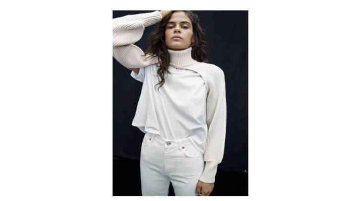 Todo se enfoca al minimalismo, el blanco como único objetivo, en esta combinación actualizada para esta nueva temporada. Sin ser aburrida, coloca detalles de tu entera exclusividad, piezas sencillas y originales y distintas. En la imagen las mangas, el cuello sobre personalizado para engalanar tu outfit complementado con una sencilla camiseta y unos jeans.