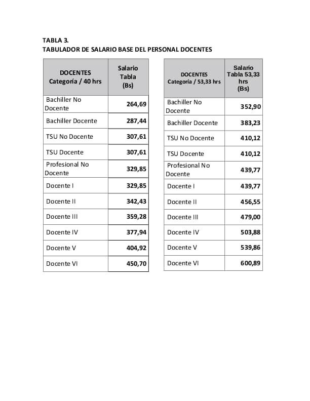 El tabulador de salario base del personal docente señala que los docentes ganarán desde 264,69 bolívares (bachiller no docente) hasta 450,70 bolívares (docente VI). Asimismo, agrega que los docentes que trabajan poco más de 53 horas a la semana tendrán un ingreso mensual desde los 352,90 bolívares (bachiller no docente) hasta 600,89 bolívares (docente VI).