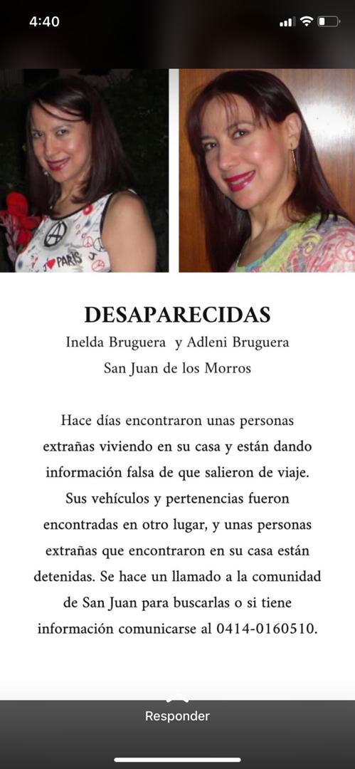Quince días llevan desparecidas las hermanas Inelda del Carmen Brugera Alvarado de 69 años y Adleni Josefina Brugera Alvarado de 54 años, ambas residenciadas en la Quinta Olga de la avenida Los Llanos, al lado de un supermercado muy frecuentado de San Juan de los Morros, estado Guárico.
