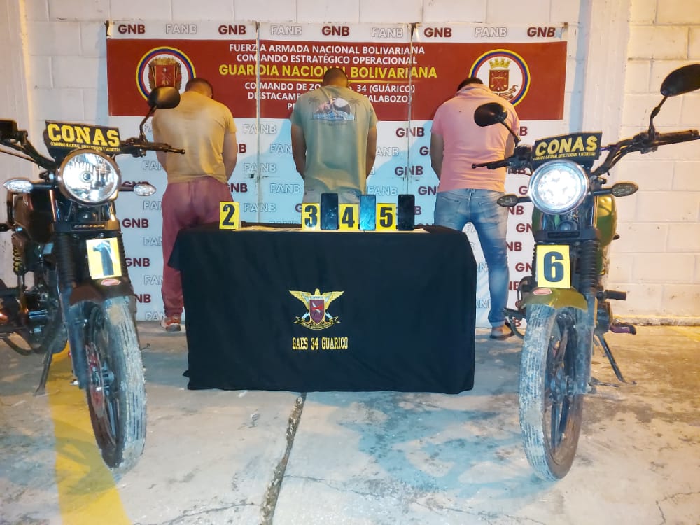 En el procedimiento fue decomisado tres equipos celulares, dos motos marca Bera y diferentes monedas extranjeras y nacionales. El caso fue puesto a la orden del Tribunal de Control N° 2, extensión Calabozo, quien pre califico el delito de extorsión.