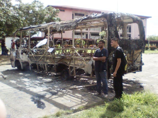 Señaló que «fue sometido con armas de fuego y a la vez lo amenazaron con matarlo si intentaba escapar, mientras incendiaban la unidad de transporte la cual fue consumida por las llamas en su totalidad, mientras que escribían consignas en las paredes del recinto universitario».