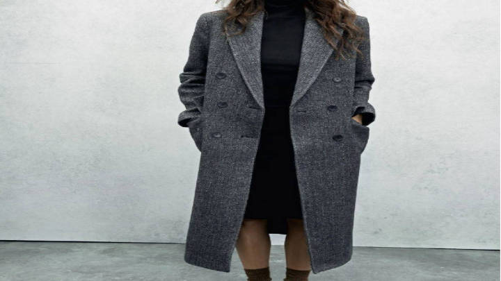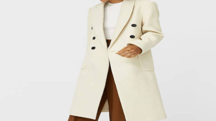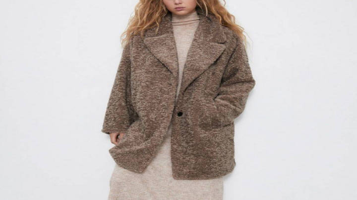 Muy similar al camel, porque su aire es discreto y elegante, y permite combinarlo con todo, Este modelo de Zara, de gran cuello y solapa , se despliega con manga larga y hombreras; se amortigua con su confección en un 50% de lana reciclada.