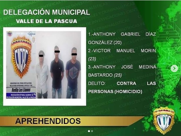 Según una publicación en la red social Instagram @cicpcvalledelapascua los sabuesos indican que fueron capturados Anthony Gabriel Diaz Gonzalez de 20 años, Víctor Manuel Morin de 23 años y Anthony Jose Medina Bastardo de 25 años por el delito contra las personas (Homicidio), contra Contreras Ruiz.